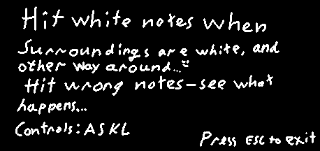 Rules are simple, a normal rhytm game where you hit notes, but every 8 seconds colors inverse, and you have to think what notes to hit! Hitting wrong notes fill up the bar, and its filled, well you'll see what happens!